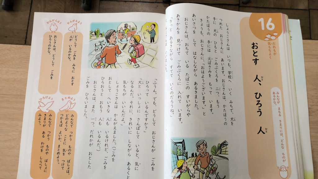犬を散歩させながら、いつもゴミ拾いをしているおじさんに出会うしょうこさん。「どうしておじさんがゴミを拾っているんですか?」「…気になるんだ。それに、きれいにしながら歩くと…」「…ごみを落として平気な人もいるけれど、ゴミを拾おうと思う人もいるんだ」