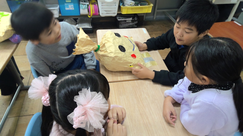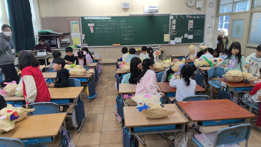2年生図工、紙工作で大きめのぬいぐるみサイズの「ぎゅっとしたい友だち」を完成させた2年生。今日は、その「友だち」をクラスの「友だち」に紹介する時間です。