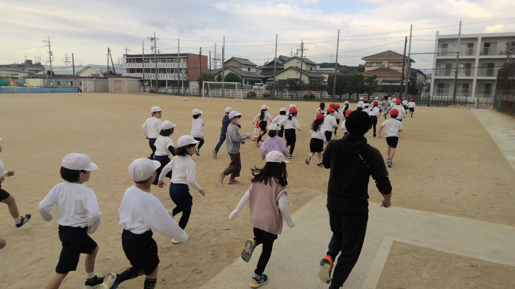 自分のペースとは、よく使われますが、安定した自分なりのペースを体得するには練習が必要です。何度か繰り返してき。た2年生。少しずつ落ち着いた走りができてきた子も見られます。中にはまだ短距離走のように最初ダッシュしてしまう子もいますが、それもやる気の現れ。