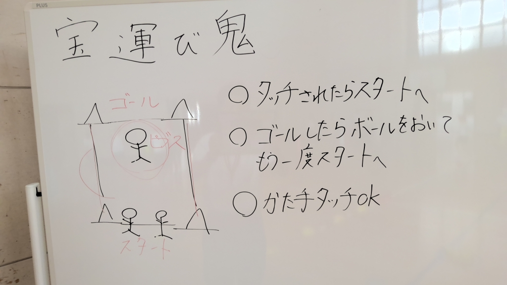 体づくりの一環、走る運動。「宝運び鬼」と名付けられた、2対1の鬼ごっこ。