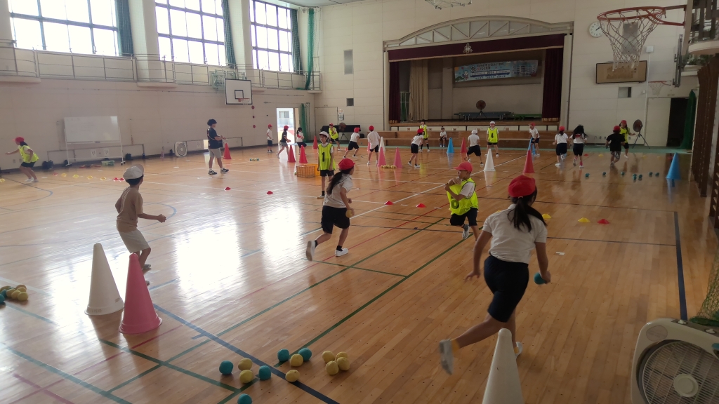 限られたゾーンの中で、ビブスを着た鬼のタッチをかいくぐり、宝(ボール)を向こう側へたくさん運び入れる鬼ごっこ。やみくもに進むと簡単にタッチされて振り出しへ。そこで一人がおとりになったり時間差で進んでみたり。頭を使いながら、自然とダッシュする4年生。楽しんで体を鍛えています。