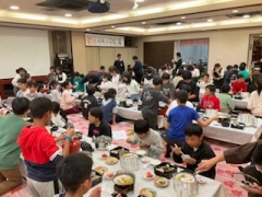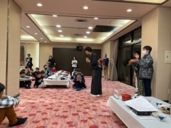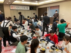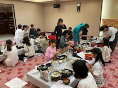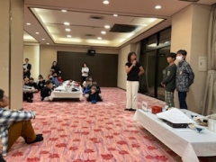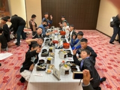 入館式を行いホテルの方々に挨拶して、ホテルの方からもお言葉をいただきました。いただきますの挨拶の後、待ちに待った夕食の時間です。楽しそうに食事しています。