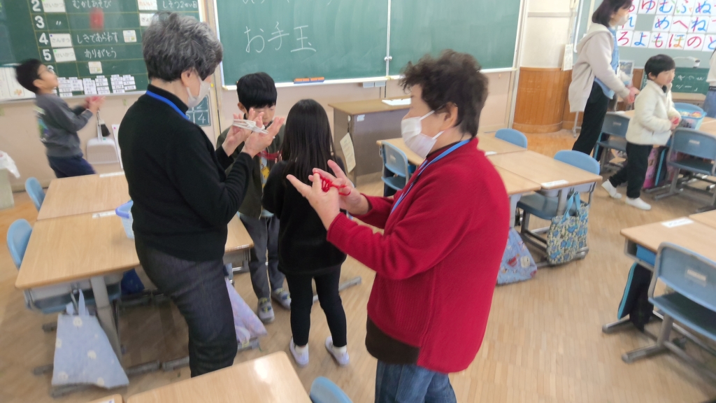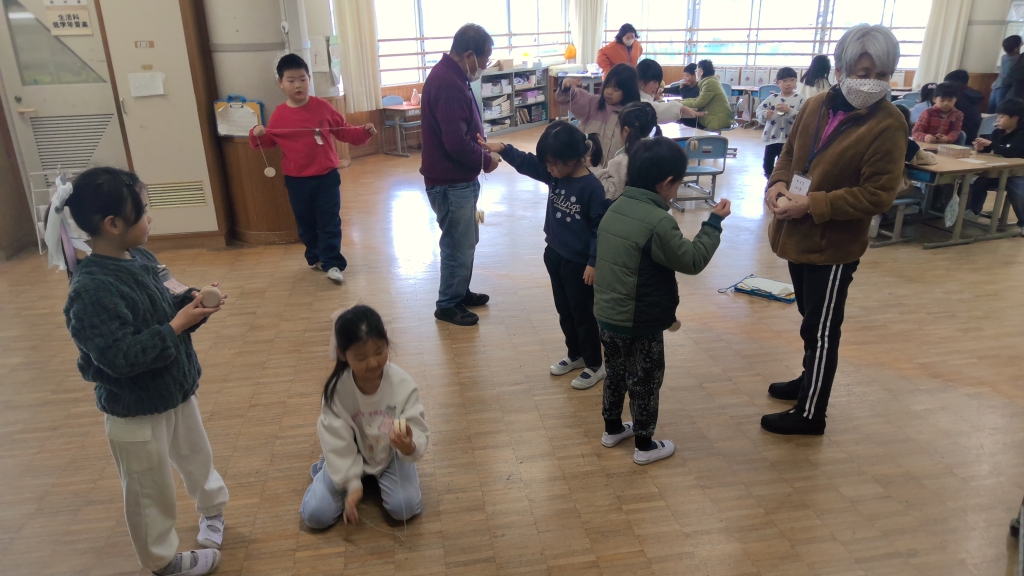 地域高齢者の方々の集い(ついたち会)から16名の方をお招きし、昔遊びの手ほどきをしていただきました。