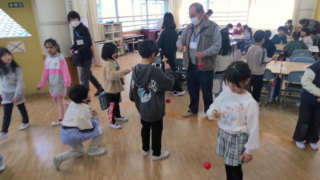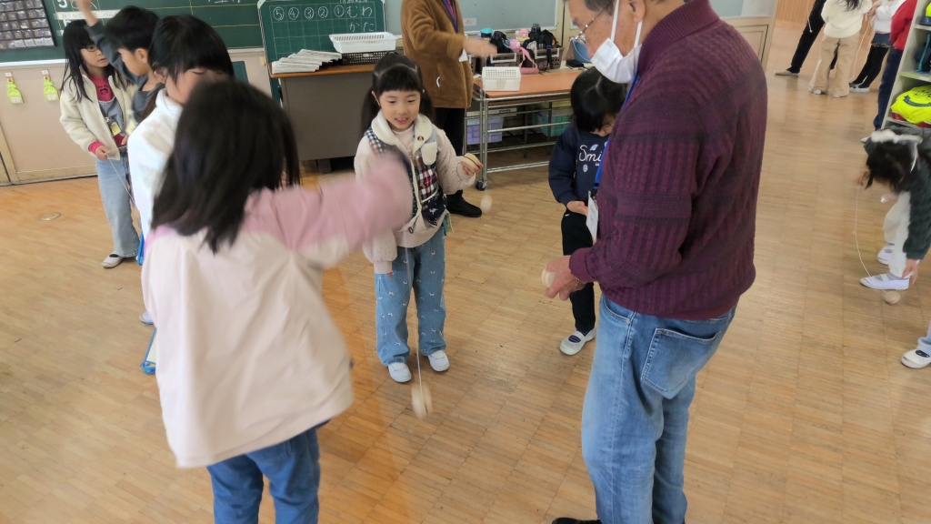 昭和の遊びも、1年生にとっては新鮮で難しいものです。技術が必要な「けん玉」「コマ回し」などは成功者はなかなか現れません。その中で成功すると「うまい!」「すごい!」とほめてもらい得意げの表情。自分も続こうとコツを教えてもらおうとする1年生。
