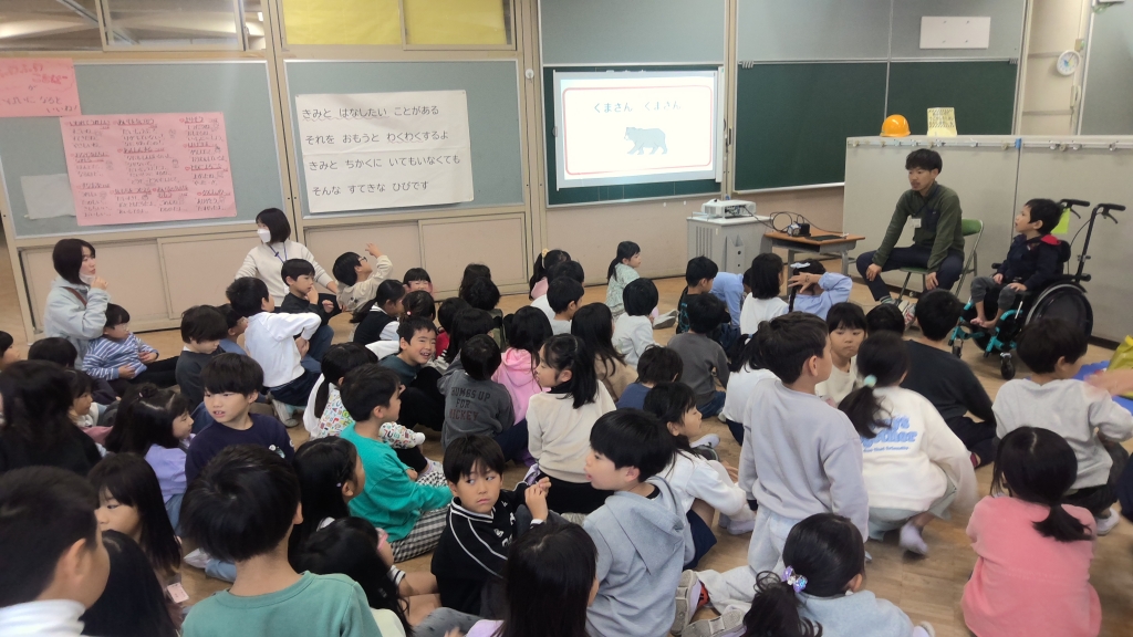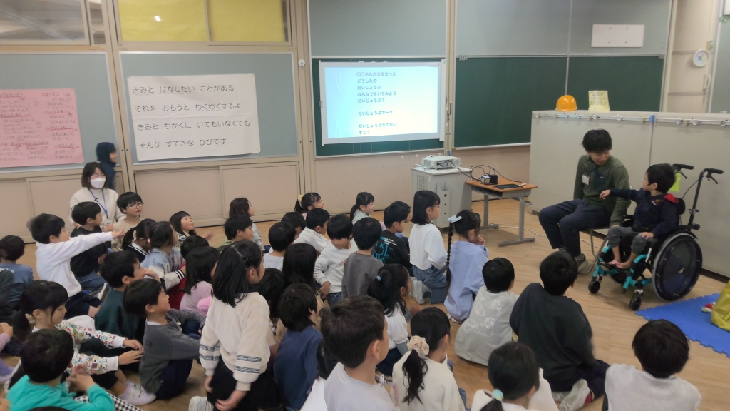 1年生に、校区在住で、にじ学園に通学している友達が来校。自己紹介から一緒に歌ったりゲームしたり、笑顔で交流しました。また3学期にも交流会があります。同じ校区で共に成長していく仲間とつながりを深めていってほしいですね。