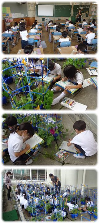 教室で、これまでのアサガオの様子を思い出すとともに、水やりのときに見ている今のアサガオの様子を出し合い、4回目の観察のポイントを確かめたら、「あさがおにっき」を探検バッグにはさんでバルコニーへ。