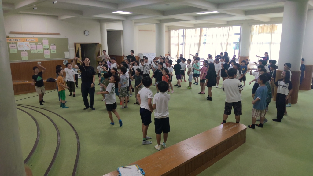 「納豆は好き?」「縄跳びは?」「桃上げ10回…」など、なかまに声をかけて交流し合う3年生。笑顔で活動しています。