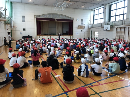 4,5年生は今度、2,3年生と一緒に学校探検をするために6年生に色々な説明を聞くリハーサルをしています。