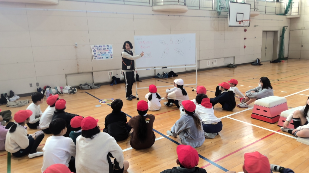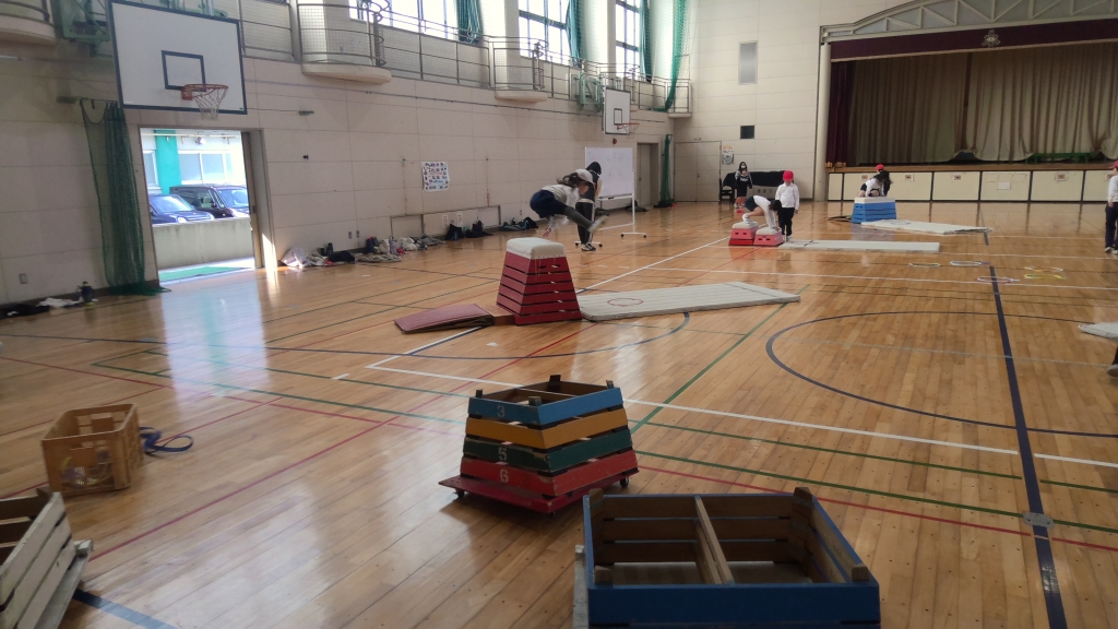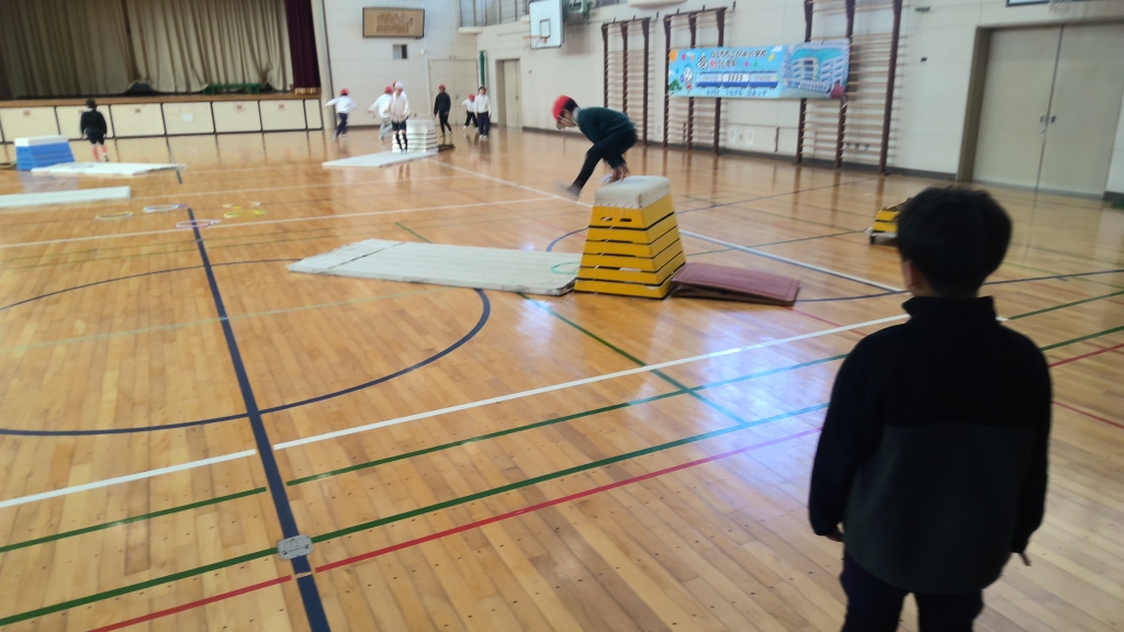 それらを求めて4年生が挑戦。今日は跳び箱を横向きにして、着地の位置を変えながら、自分の身体をうまくコントロールできるように頑張っていました。