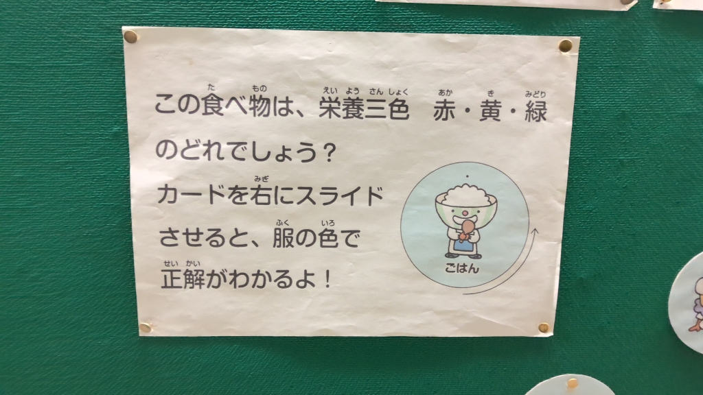 ひながっ子が、栄養素とバランスよい食事に関心を高めることができるように掲示されています。日々の食生活を大切にしていきたいですね。