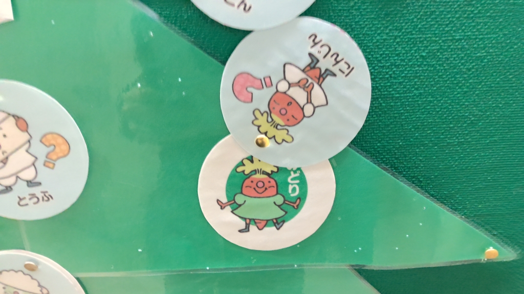 問題の隣には、クリスマスツリーを形どり、飾りとして様々な食べ物の名前が張られています。