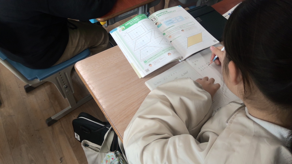 思考の末に平行四辺形の公式にたどり着くことができるのか、頑張る5年生です。
