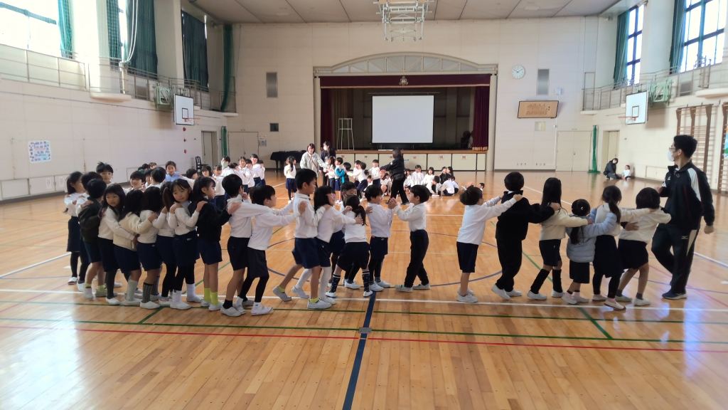 1年生に、校区在住で、にじ学園に通学している友達が来校。自己紹介から一緒にダンスしたりゲームしたり、質問タイムを設けたりしながら笑顔で交流しました。同じ保育園出身で、久しぶりに会う1年生も笑顔に。校区で共に成長していく仲間とつながりを深めていってほしいですね。