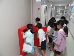 4年生は防災の学習をしています。校内になる消防設備をきめ細やかに調べていました。