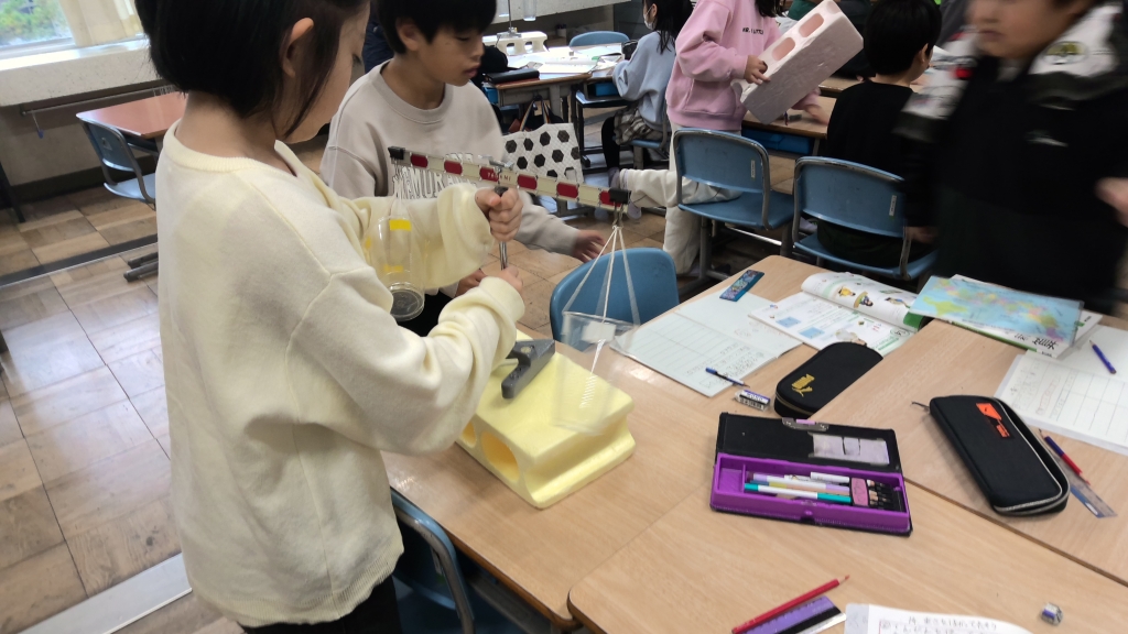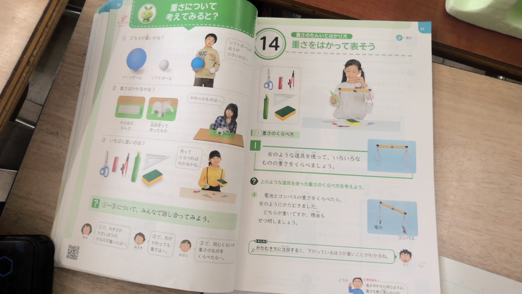 通常、高学年理科で使用する実験器具を、3年生算数用にひと工夫して配られました。さあ、この天秤を使って上手く一番重い物を探すことができるかな?コップに選んだものを入れて、どちらに傾くかを記録していく3年生。手と頭を使って思考しています。