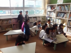 本日、朝の学活時に6年生の各クラス、20分休みに図書室でマジョリカさんによる読み聞かせをしていただきました。いつもありがとうございます。絵本に集中する日永っ子の姿がありました。