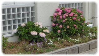 新校舎前や体育館の西など、校庭には何株ものアジサイが植えられていて、梅雨のころになると、ピンクや水色、うす紫の花をたくさん咲かせて、目を楽しませてくれます。