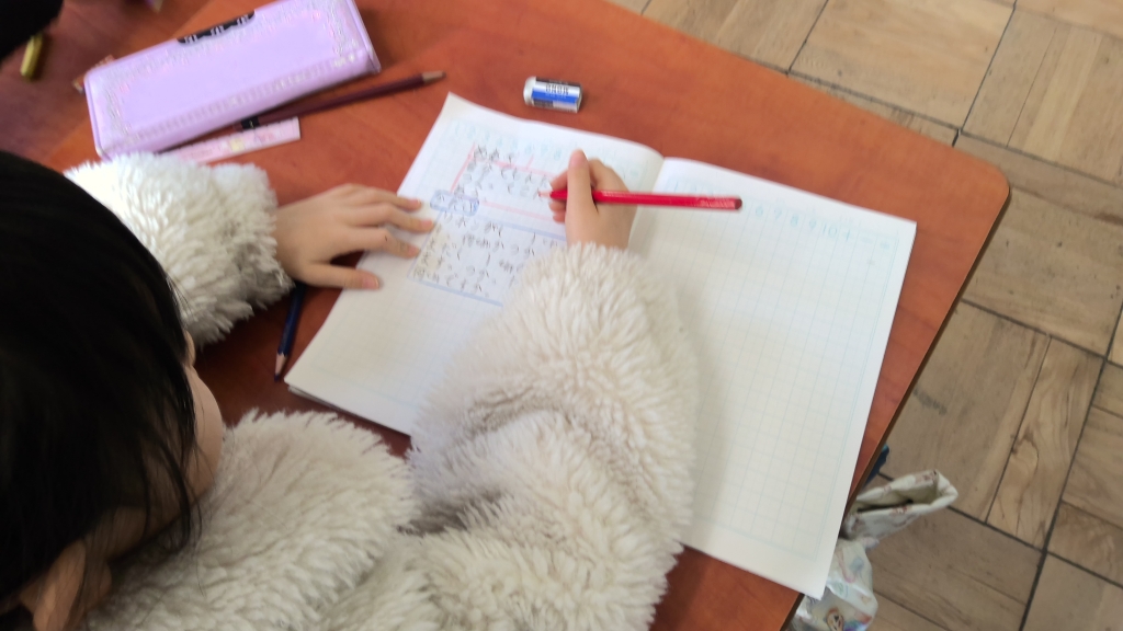 今日は、数字に当たる箇所に、各自が好きな数を入れて問題作成。互いに解きあってスキルアップ。思いもかけず大きな数字を入れて、計算が大変になってしまうことも。