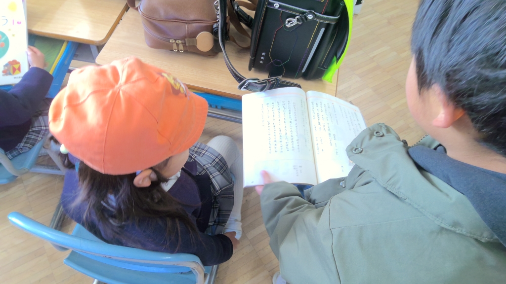 自己紹介タイムやランドセルを背負わせてあげたり、教科書を見せて説明してあげたり、お兄さんお姉さんぶりを見せる1年生。いつもより、しっかりした表情にも見えます。