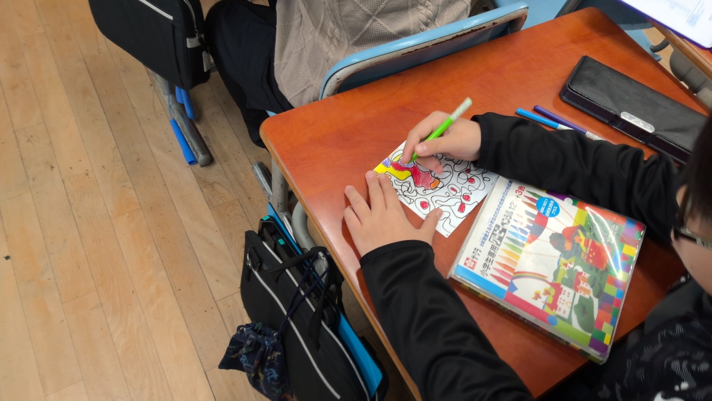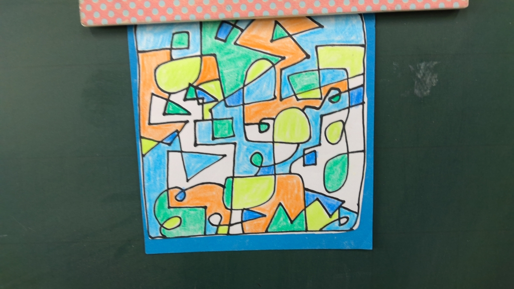 配られたのは、色紙サイズの画用紙。そこに一筆で線を描くことから始めます。思いのままにペン先を進めますから、曲線も直線入り混じた不思議な模様が。さらに着色していくと、個性あふれる作品に。カラフルなもの、シックなもの、色系統を感じさせるもの、直線的な鋭さを感じさせるもの、丸みを帯びた優しい感じのもの、幾何学的なもの…デザイナー気分になり、総作を進める5年生です。
