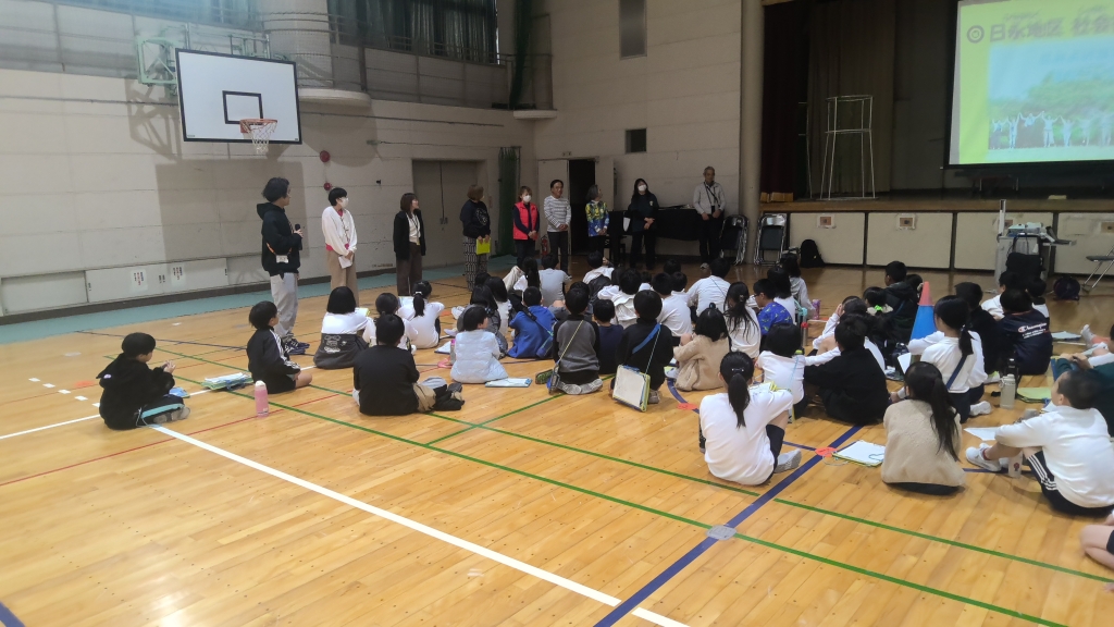 本日、日永小学校の体育館にて、株式会社稲藤の社長・稲垣さんをお迎えし、お話を伺いました。会社のことや「日永うちわ」の歴史、そしてその特徴について、たくさんのお話を聞くことができました。