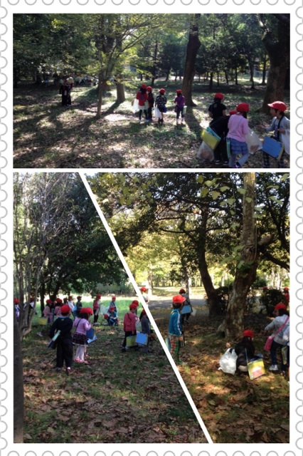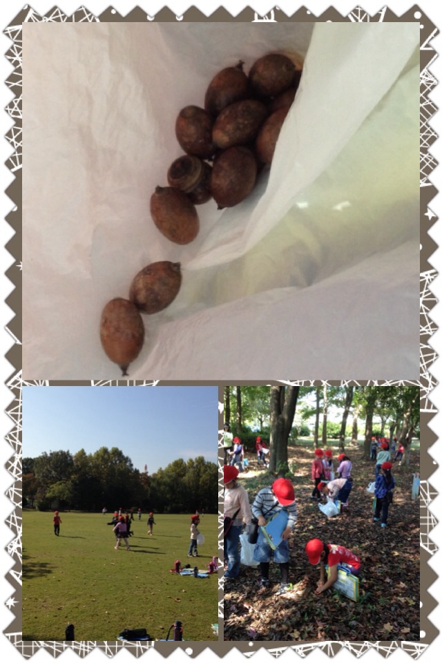 13日水曜日、秋見つけ第二弾として、南部丘陵公園に行きました。途中、笹川通り沿いにある黄色く色づいたイチョウ並木を見ながら、 笹川中学校付近を通り、目的地にむかいました。 公園到着後、山林の山道を通りながら、木の実を拾いました。 前回よりも木の実を多く見つけることができました。 たくさんと取れて、子どもたちも大喜びでした。 |