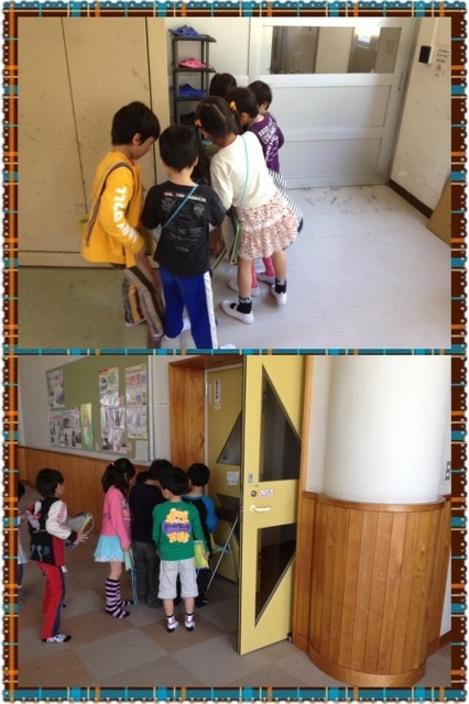5月2日(木)、生活科の時間に、二人一組で学校探検の活動を行いました。今回は、保健室、理科室、図書室、図工室、音楽室、校長室、職員室、パソコン室、体育館、家庭科室、給食室、視聴覚室の合計12箇所を見学しました。 写真は、視聴覚室前と給食室前での様子です。 |