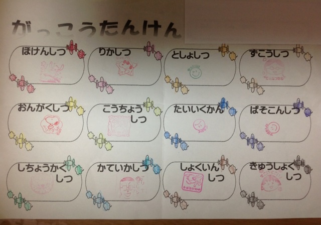 それぞれの見学する部屋に設置してあるスタンプを集め、楽しく活動を行うことができました。体育館では、ボールを使って遊んだりもしました。 実際にお兄さん、お姉さんたちが授業をしているところも見学できました。 スタンプをたくさん集めて、どこに何の部屋があるのか、発見することができました。 みんな、大変よくできました。 |