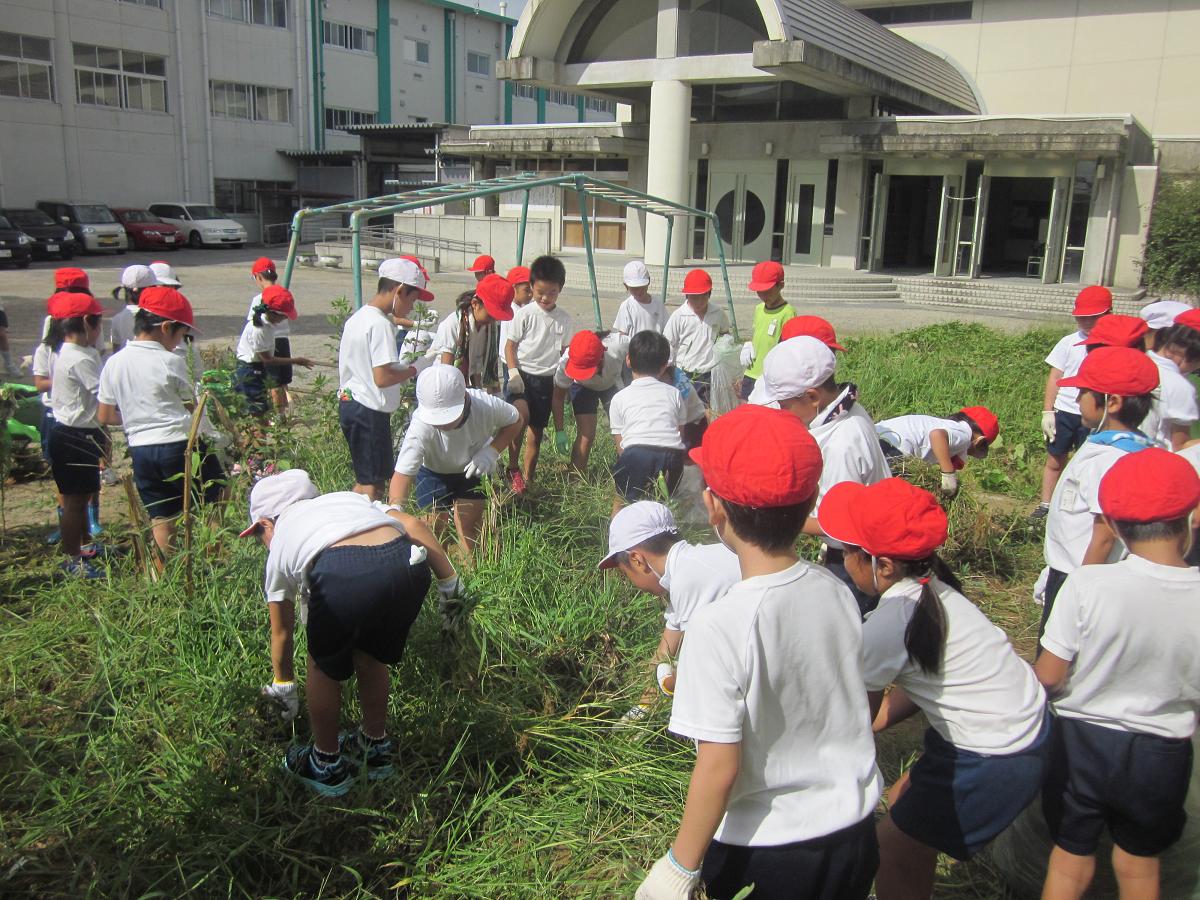 1学期に栽培活動を行った畑をきれいに片付けました。スイカ、きゅうり、とうもろこし、トマトなどたくさんの野菜が収穫できたので、その畑に感謝して作業をしました。片付け終わると、17袋の草の山ができました。みんな汗びっしょりになってがんばりました。