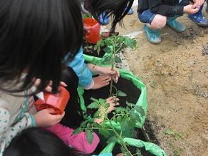 雨が降りやんだ午後、野菜の苗を植えました。自分の育てる野菜が大きくなる様子を観察し、最終的には収穫をします。一生懸命、責任を持って育てていきたいですね。