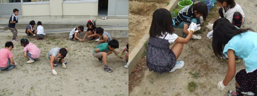 本日6月5日は「環境の日」です。そこで今日は、全校で1限目に校庭や中庭のゴミ拾いや草取りをしました。3年生は、中庭の畑の周りの草抜きをがんばりました。