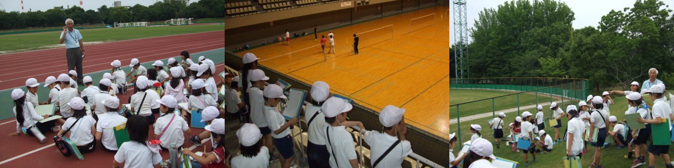 今年も3年生は総合の時間、「日永のまち」についての学習をしています。今日は午後から中央緑地公園に行き、体育館や野球場などの施設を見学しました。