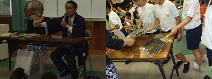 校区で伝統工芸品の「日永うちわ」を作り続けているイナトウさんに来ていただき、たくさんのお話しを聞かせていただきました。伊勢型紙のうちわ、扇ぐといいにおいがするうちわ、持ち手が笛になっているうちわなど、一つひとつ手に取り涼しい風を体験しました。