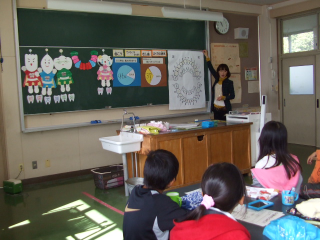 まず初めに歯の名前の復習をしました。「前歯」「奥歯」「犬歯」「きゅう歯」の場所と虫歯率について学習した後、歯の磨き方を教えてもらって実際に家でつかっている歯ブラシをつかって鏡を見ながら歯をみがきました。歯垢がついているところが赤くなるような液を歯に付けたので、普段みがけていない部分やよごれやすい部分がよくわかってよかったです。