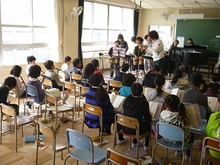 音楽では、木琴や太鼓、リコーダーなどそれぞれのパートに分かれて「風になりたい」の合奏をしています。