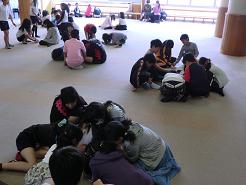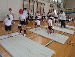一年生がいっぱいに手を振って,マットの先に飛び出します。六年生は,着地でふらつく一年生にアドバイスしたり,一年生の跳んだ距離を測定したりしました。