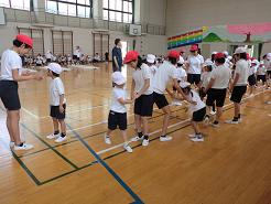 六年生は,一年生の手をとって,横跳びのお手本になるところからスタートしました。
