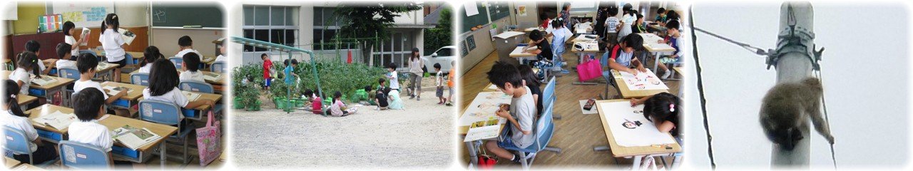 1年生が国語の時間にペア音読をしていました。隣同士がペアとなり,1文ずつ交代で読んでいきます。大きな声ですらすら読めたペアにはクラスのみんなから大きな拍手が送られました。指導者が「次に読みたいペア」と声を掛けると,「ハイッ」という大きな声と一緒にたくさん手が挙がりました。(1枚目)2年生が育てている野菜の観察をしていました。野菜は随分大きくなり,子どもの背丈より高く伸びたトウモロコシもありました。トマトやピーマンも青い実をつけています。子どもが走り寄ってきて,「見てっ,ぼくが一人で育てたの」と言って,両手に大事そうにのせたナスをニッコニコの笑顔と一緒に見せてくれました。(2枚目)2年生の図工。絵のテーマは「楽しいこと見つけた」。ドッジボールやゲームなど楽しい場面を思い浮かべて自分を主人公に描いていました。楽しい水泳を描いた場面はなぜかシャワー。眼をつむって体に力を入れて冷たい「地獄のシャワー」に耐える姿から,なぜかプールに入っているときの楽しさや喜びがいっぱい伝わってきました。(3枚目)珍客が学校を訪れました。電柱に登っているのはなんとニホンザル。この後,体育館の屋根に飛び移り,行方はわからなくなりました。学校では,すべての窓と戸を閉めてしばし厳戒体制に。その後,学校から出ていき事なきを得ましたが,子どもたちにはサルに出会ったときの心得を4つ伝えました。最近,河原田や常磐にも出没しているそうです。学年園の野菜についている歯型は,もしかしたらサルのものかもしれません。(4枚目) |