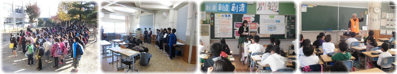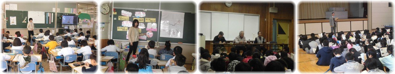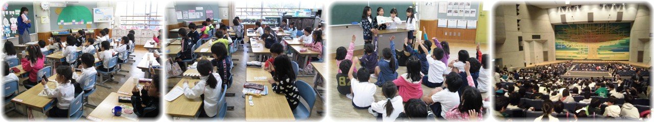 1年生の国語です。学習のまとめとして「自動車図鑑をつくろう」という大きなめあてに向かって,「じどう車くらべ」という説明文を学習しています。今日はクレーン車の仕事とつくりについて説明してある文を読み取る活動をしました。最後には教科書には載っていないつくりについて挿絵から見つけ出す活動をしていました。(1枚目)14日から始まった養護による「歯」についての学習も今日の2年生で最後です。「むし歯菌のムッシーをやっつけろ」というテーマで,初めにムッシーがいる歯はどの部分の歯かを予想した後,歯の場所に応じた正しい歯みがきの仕方を覚えました。そして実際に歯みがきを行いながら歯ブラシをやさしく動かすこと,歯ブラシを縦に使うこともあることなどを学びました。(2枚目)5年生の「総合」です。今日は四日市公害の語り部3名に来校いただき,これまで四日市公害について学習を進めてきた中で疑問に思うことなどを質問して答えていただくという活動を行いました。四日市公害裁判への取組の苦労やぜんそくの苦しみなど,質問にていねいに答えていただくお話からは語り部の方の熱い思いが伝わってきました。(3枚目)人権擁護委員2名に来校いただき,6年生の「人権教室」を行いました。まずは人権養護委員の仕事についてのお話がありました。その後,過去に実際にあったいじめの事例をもとに,いじめを許さない心を持つことの大切さや障害を持った方の事例をもとに,「人の見方」についてのお話がありました。子どもたちはじっと静かに真剣に話を聞くことができ,人権擁護委員の方からは「人の話をしっかり聞けることも人を大切にしていることだよ」というメッセージを送られました。(4枚目) |