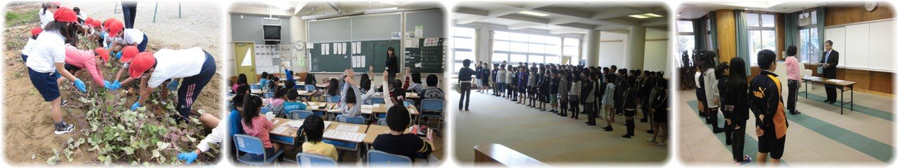 1年生が1学期から大切に育ててきたサツマイモの芋ほりをしました。つるの先をたどっていって土を手で掘ると大きな芋が顔を出しました。なかなか芋が抜けなくて苦労している子もいましたが,芋を手にした子どもたちはにっこり笑顔でした。芋ほりを終わった後は,つるで縄跳びをして遊んだり教室で観察カードに芋の絵をかいたりしました。(1枚目)2年生は国語で「お手紙」を学習しています。「お手紙」の話のあら筋をとらえるために,カードに書かれたいくつかの文章を順番に並べる活動をしていました。途中で意見が分かれたときは,教科書を見て確認していました。(2枚目)6年生の音楽です。11月15日(金)に行われる三泗音楽会に出場するために学年練習が始まっています。全員で合唱練習した後,低音・高音に分かれてパート練習にも取り組んでいました。指導者のアドバイスが入ると子どもたちの歌声が大きく変わります。これから練習を重ねていく中で99名の心が一つになり,すばらしい合唱に近づいていくことでしょう。当日が楽しみです。(3枚目)夏休みに自由研究をがんばり,三泗社会科作品展・三泗科学展に出品された子どもたちの表彰式を行いました。表彰式の様子はビデオに撮って,校内放送で全校に流します。(4枚目) |