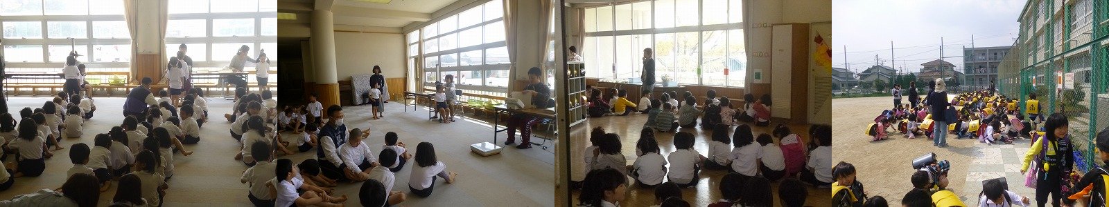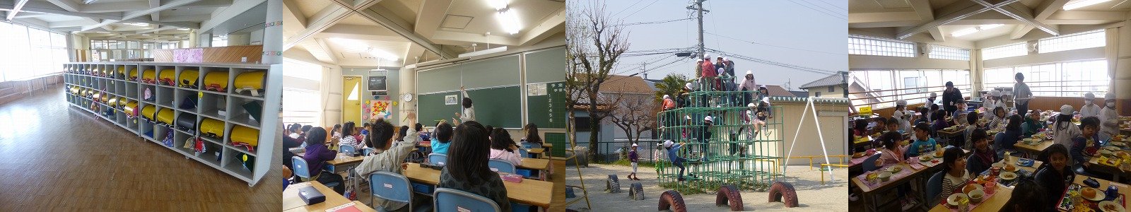 今日は、登校したら自分でランドセルを整えてロッカーに入れるという昨日学んだことからスタートしました(1枚目)。そして、今日は新たに鉛筆の持ち方(2枚目)、運動場の遊具での遊び方(3枚目)、給食の配膳の仕方(4枚目)を学びました。 |