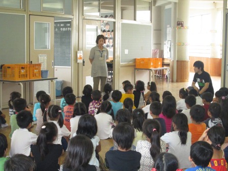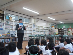 今日、図書館司書の先生から自動車に関する本を読み聞かせ・紹介してもらいました。子どもたちは、いろんな車の形や働きについて興味深く聞くことができました。これから1年生は「じどう車くらべ」の学習に入ります。子どもたちは、これからの学習が楽しみになった様子でした。 |