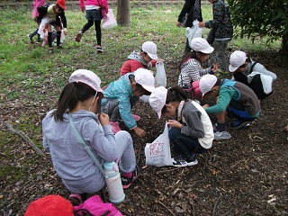 中央緑地公園へどんぐりを拾いに行きました。たくさんのどんぐりが落ちていて、子どもたちは、「こんなどんぐりを見つけたよ。」「細長いどんぐりもあるよ。」などと、とても楽しそうに拾っていました。拾ってきたどんぐりで何をするかこれから考えていきます。 |