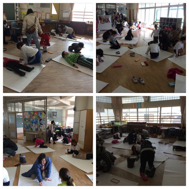 今回は生活科で学習している自分の成長についての学習の一コマでした。大きな模造紙に自分のヒト型をペアの友達と一緒に助け合いながらかきました。