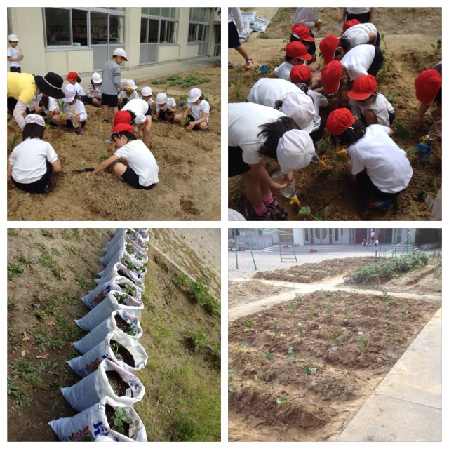 野菜の苗植えをしました。すいか、なす、きゅうり、じゃがいも、とうもろこし、トマト、ミニトマト、枝豆、オクラ、ピーマンを学年花壇に植えました。これから毎日、水やりをして、大切に育てていきたいと思います。今から収穫が楽しみです!