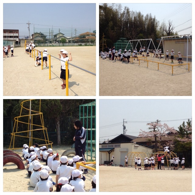 運動場で学年体育を行いました。クラスごとに、鉄棒、ブランコ、ジャングルジムなど、運動場にある遊具の使い方について学習しました。