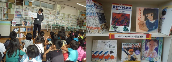 国語科では「ちいちゃんのかげおくり」の学習に入りました。今日は、図書館司書の川アさんに戦争についてのブックトークをしてもらいました。5冊の本を紹介してもらい、どの子も真剣な顔つきで話を聞いていました。