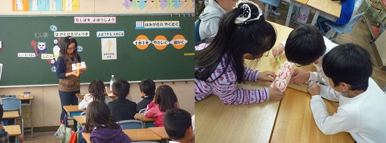 養護教諭による歯科保健指導がありました。虫歯は「さん」の力で歯を溶かしてしまうということを学習し、最後には大きな歯の模型を使って歯みがきの仕方を確認しました。歯と歯のすきまや歯と歯ぐきのあいだ、歯のみぞまで上手に歯ブラシを使ってみがいていました。おうちでもできるといいですね。