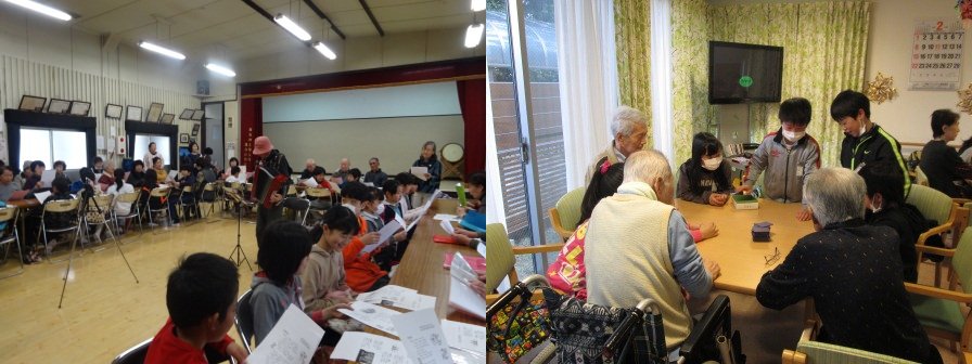 現在4年生では総合的な学習の時間に1、2学期に学んだことを踏まえて、自分でできることをしようというテーマで取り組んでいます。今日は2、3限目の時間を使って校外へ出向きました。写真は高齢者の方々との交流の様子です。