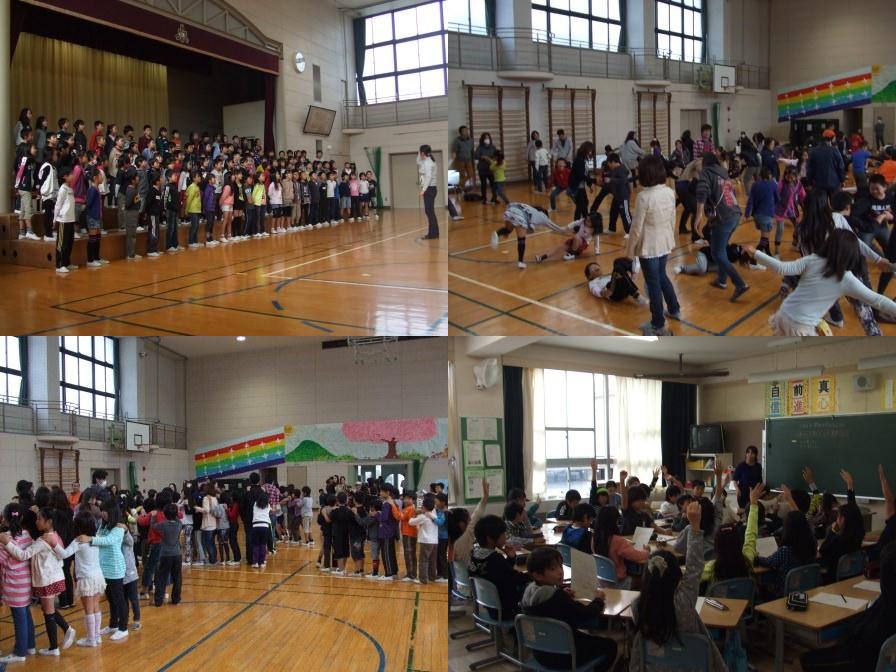 9日(土)に土曜参観があり、1、4、5限目の時間を公開しました。4限目には体育館を使って、ふれあい文化祭で歌った2曲を発表した後、保護者の方々も一緒に、体ほぐしの運動を行いました。